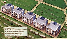 The immediate urgent necessity is to build new dormitory buildings to replace the existing inadequate mobile facilities. Work has started on five separate dormitory units, two floors per unit. Each floor, which has its own separate entrance, comprises four bedrooms, each with its own bathroom facilites, and a central kitchenette / sitting area. There is space for three students per bedroom. Upon completion of all five units, the new dormitory will have facilities for 120 students.